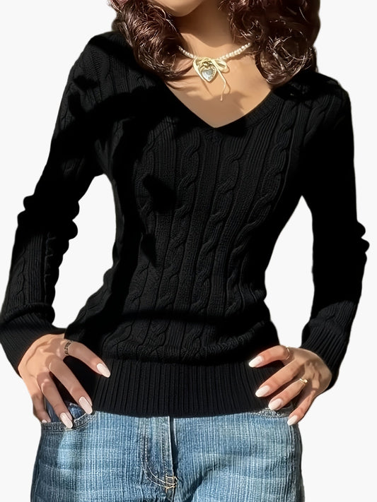 Damen Strickpullover mit Zopfmuster und V-Ausschnitt – Modischer Freizeitpullover für Alltag und Büro