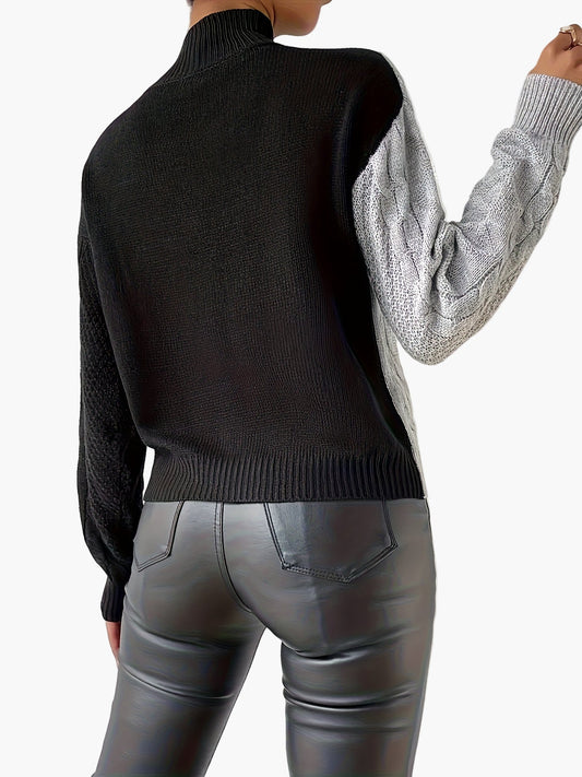Damen Pullover im Patchwork-Design mit hohem Kragen – Eleganter Strickpullover für Alltag und Büro