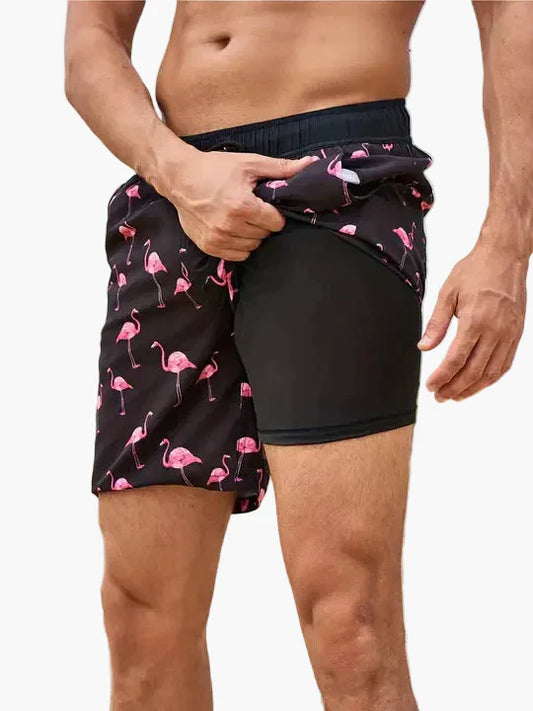 Herren Badeshorts mit Kompressions-Innenshorts – Tropischer Stil für Strand & Sport