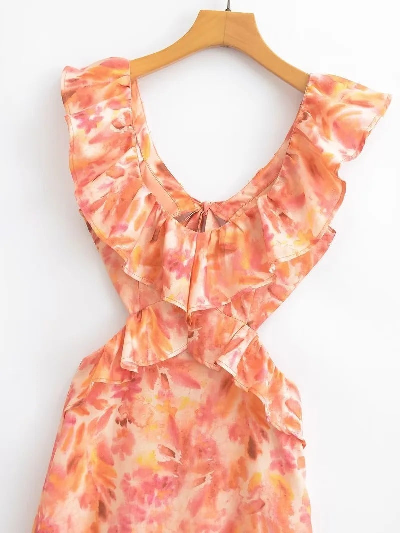 Bring fresh energy to your summer wardrobe with this stunning women's maxi dress with ruffles. The dress impresses with its lively, watercolor-inspired pattern that combines delicate orange, pink, and yellow tones to create a radiant, feminine look. The deep V-neckline with elaborately crafted ruffles adds a romantic touch, while the sleeveless, high-cut waist flatters your figure and offers high comfort all day long.