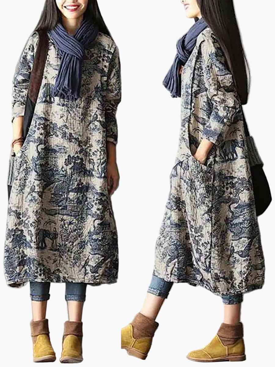 Damen Vintage Freizeitkleid mit Print – Lockeres Langarm Winterkleid für Alltag & Plus Size