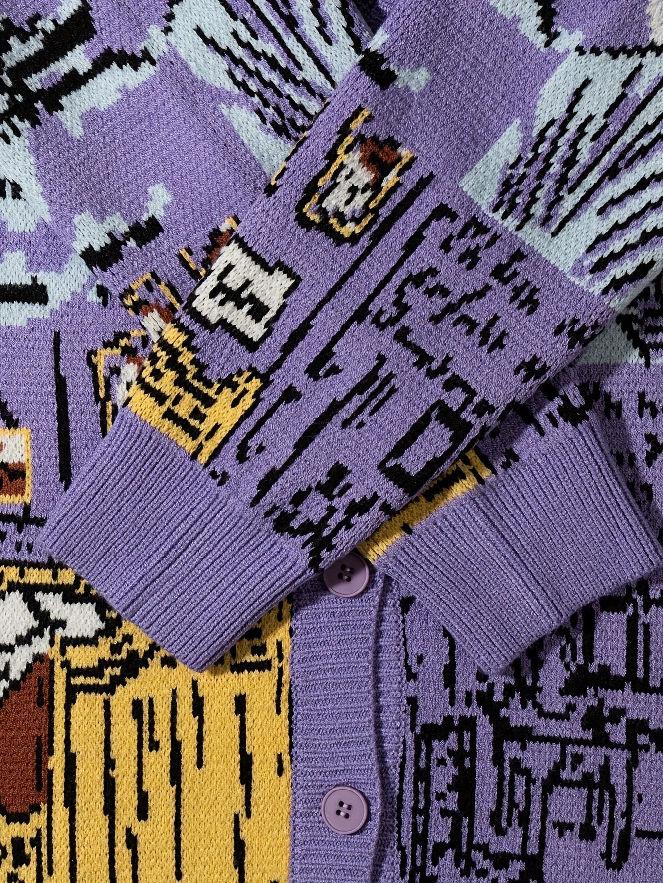 Mit ihrem lockeren Schnitt und dem angenehmen Strick eignet sich der Cardigan perfekt für die kühleren Tage im Herbst und Winter. Der V-Ausschnitt und die Knopfleiste sorgen für einen klassischen Look, während das farbenfrohe Motiv jedem Outfit Charakter verleiht. Perfekt für Freizeit, Kunstliebhaber oder als Statement-Piece im Alltag.
